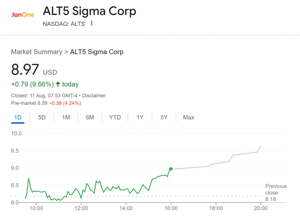 The shares of ALT5 Sigma’s share price surged 9.66%, closing at $8.97, up $0.79 on the day.