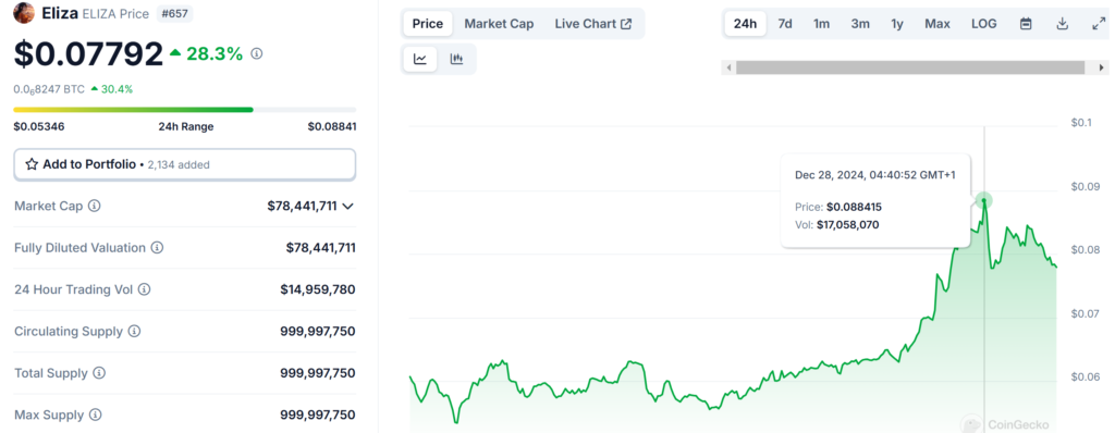With a circulating supply of 1 billion ELIZA tokens, the project currently maintains a market capitalization of $78,441,711, demonstrating significant market interest.