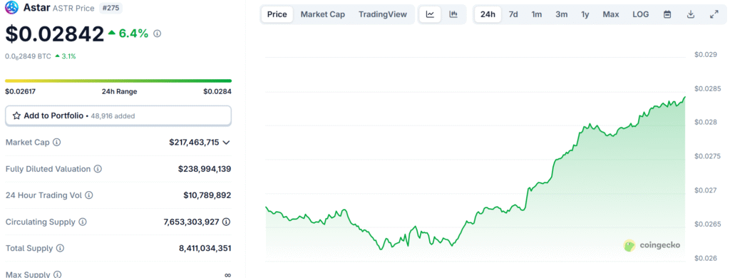 The token’s current market capitalization stands at approximately $217.4 million, based on a circulating supply of 7.7 billion ASTR.