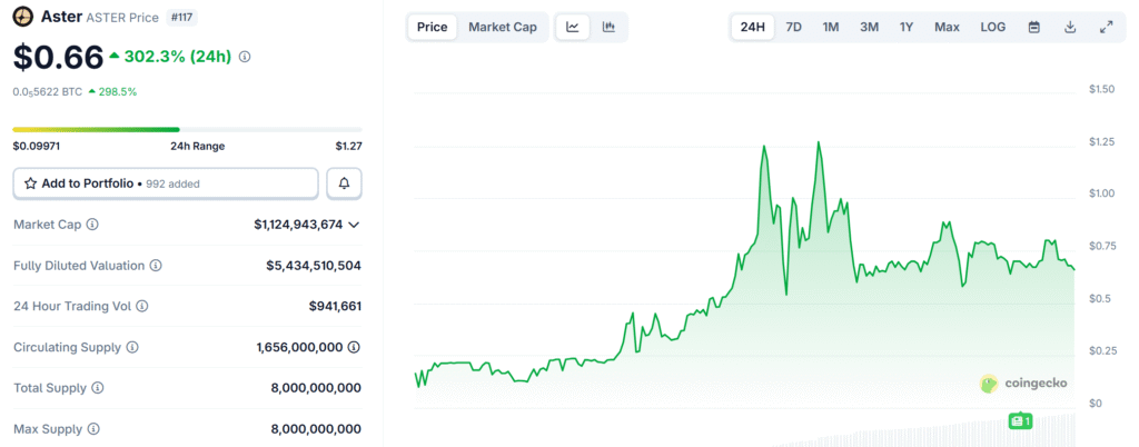 Currently, trading volume is $941,662, and with a circulating supply of 1.7 billion tokens, ASTER boasts an impressive market capitalization of over $1.12 billion.