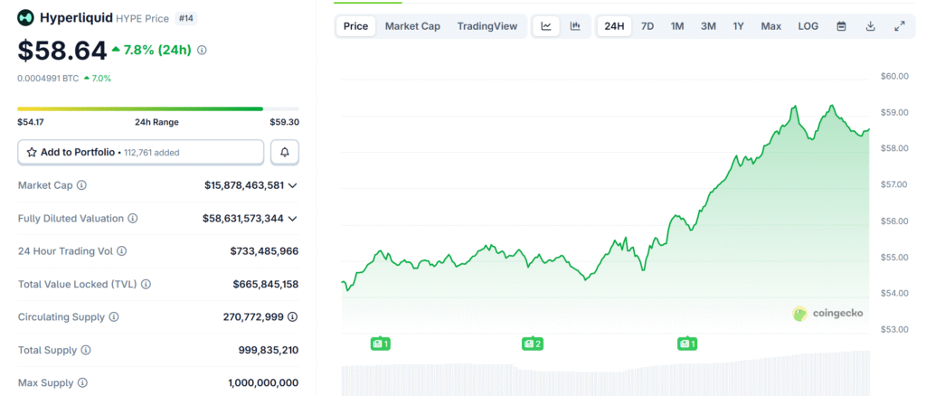 On Thursday, Hyperliquid reached an all-time high of $59.30, then pulled back before settling at $58.44.