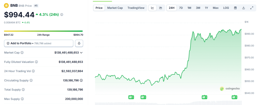 BNB is trading at $989.92 and has gained 4.17% in the last 24 hours and over 10% in the last week, with a volume of $2.53 billion.