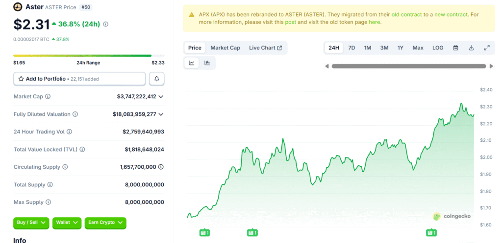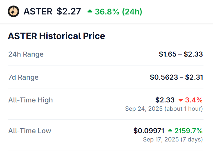 Aster’s revenue grew as ASTER reached a new all-time high (ATH) at $2.33, an increase of 3.4% in the past 24 hours, indicating investor enthusiasm and rising platform adoption.