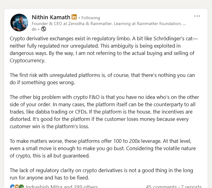 Kamath said the lack of clarity on crypto derivatives regulation “is not a good thing in the long run for anyone and has to be fixed.” He called on policymakers and industry participants to close the gaps that leave retail traders exposed to outsized risk and little recourse.