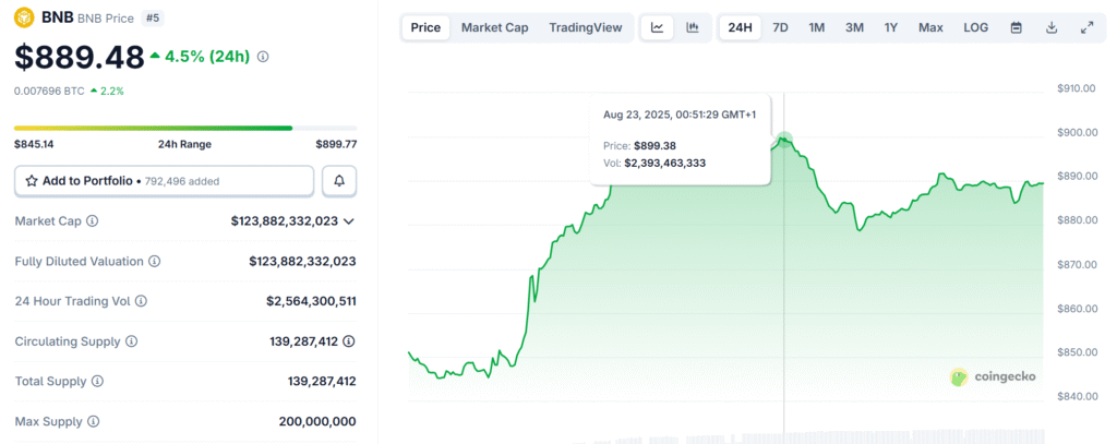 Analysts are watching the $880 mark as key support. If BNB continues to close above that level, it could reach several higher targets, such as the Fibonacci extension at $923 or even $950–$1,000 in the short term.
