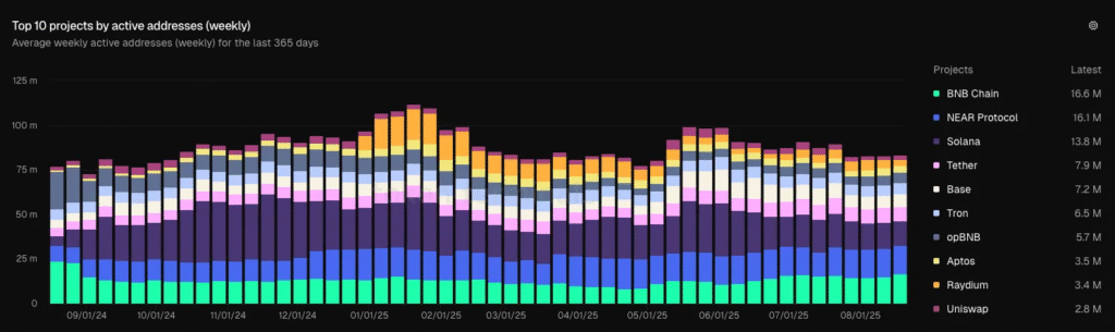 As a blockchain, BNB Chain still leads user activity, which ranks as No.1 for weekly active addresses at 16.6M, followed by NEAR (16.1M), and Solana (13.8M).