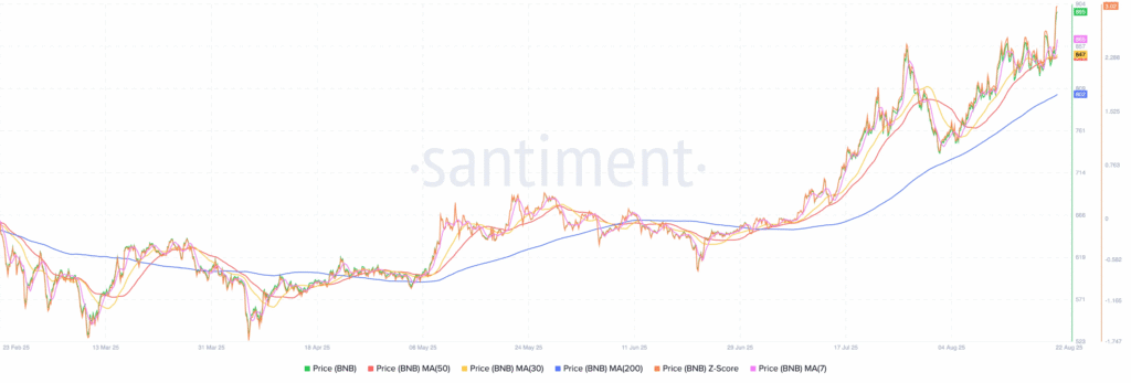 BNB continues to surge against the backdrop of the broader crypto market, creating all-time highs: Ethereum just came off a new all-time high of $4,885.61 on August 22, and Bitcoin hit a record of $124,128 on August 14, scaling to record highs due to ETF inflows and robust on-chain activity.