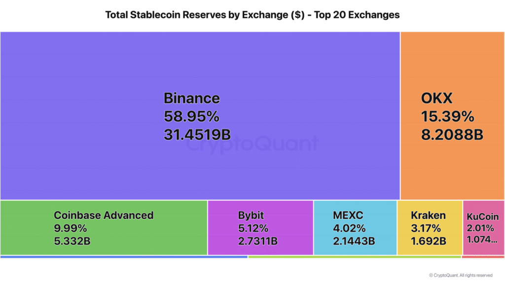 According to calculations by CryptoQuant, this accounts for a commanding 59% of total stablecoin holdings across major platforms, solidifying Binance’s dominant role in crypto market liquidity.