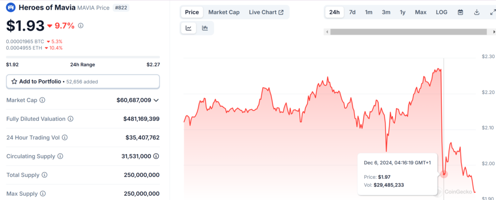 MAVIA, the token behind the game Heroes of Mavia, saw a 9.7% drop in value.