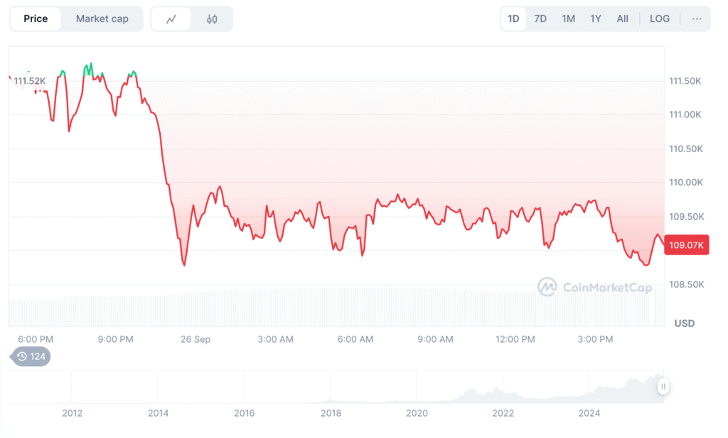 The move left BTC trading near $109,200.43, down about 2% on the day and almost 6% for the week.