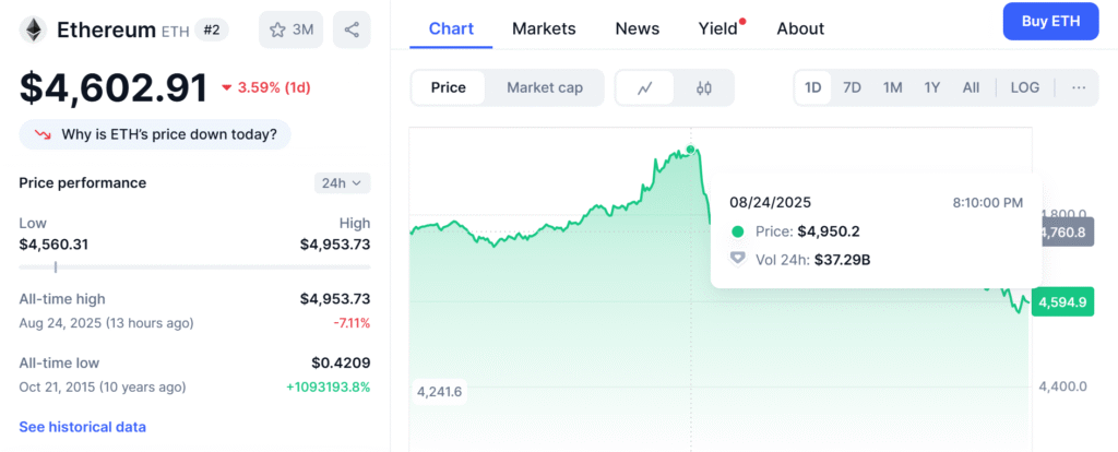 This aggressive move led to Ethereum hitting its record ATH of $4,953.73 on August 24, and such an interesting scenario illustrates how whales cause decisive price shifts that shape the overall market.