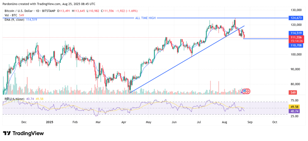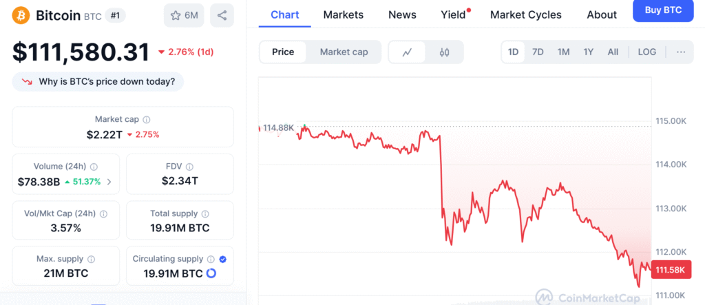 Bitcoin’s price has declined to $111,935 after a whale’s constant sell-offs sent shockwaves through the market.