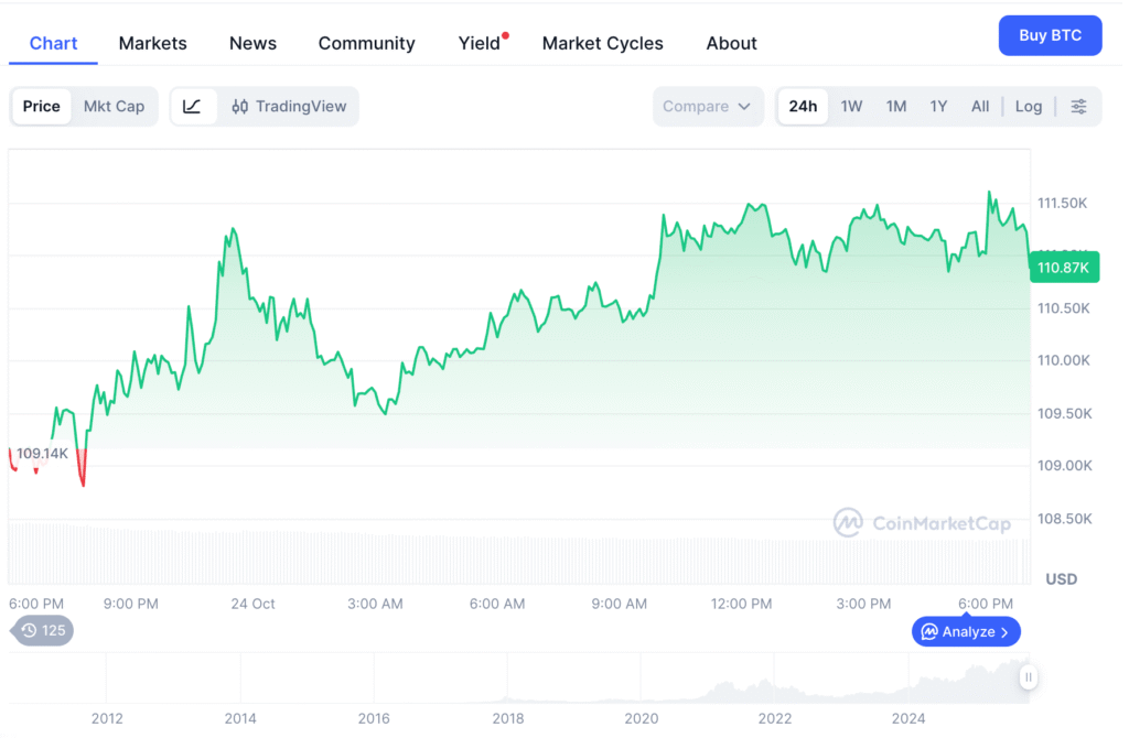 Bitcoin had quite a jump today as it went above $112K line and then slowly came down to $110,578.77. It is still up by 1% in the last 24 hours, and the 24-hour trading volume is down by 23.66%. The global market cap is at $2.21 trillion.