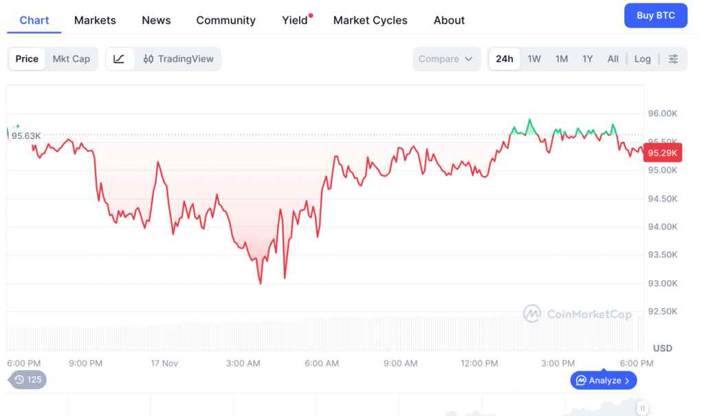 Bitcoin is trading at $95,427.41 and is down by 1% in the last 24 hours. The global market cap is at $1.9 trillion. The 24-hour trading volume is up by 80.57%.