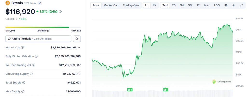 As of this writing, Bitcoin is exchanging at $116,932 USD, which is a 1% rise from the previous 24 hours and a 4.8% gain over the past week.