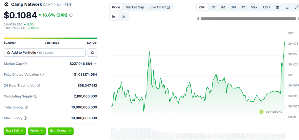 Currently, the CAMP token is worth $0.1092, with a well-supported 24-hour trading volume of over $58.3 million.