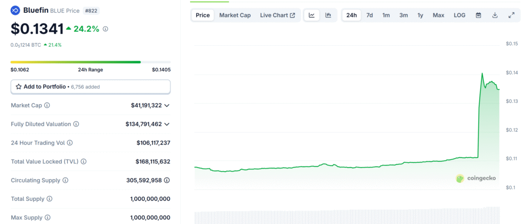 Bluefin’s current market capitalization now stands at approximately $41.2 million, backed by a circulating supply of 310 million BLUE tokens.