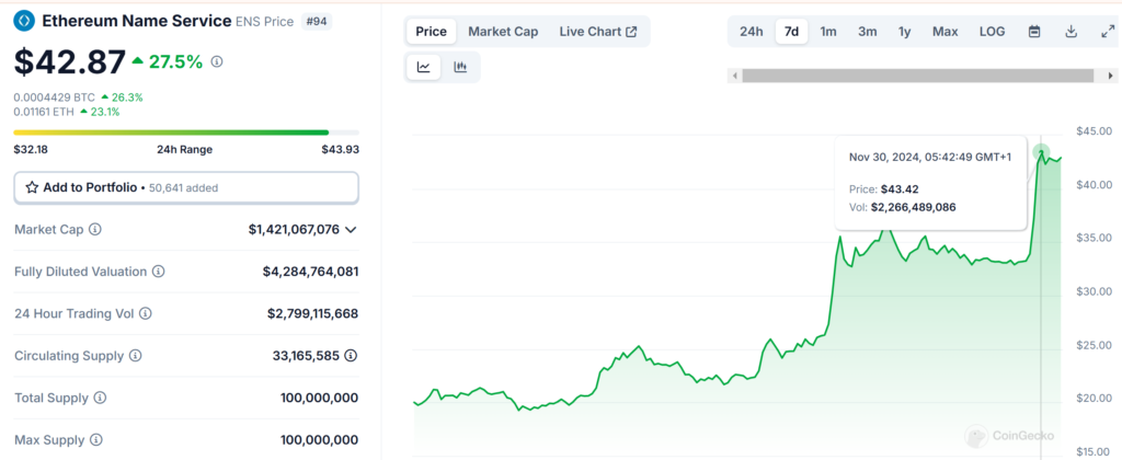 According to on-chain analyst Ember, the price of ENS has skyrocketed by an impressive 116.64% in the past week alone.