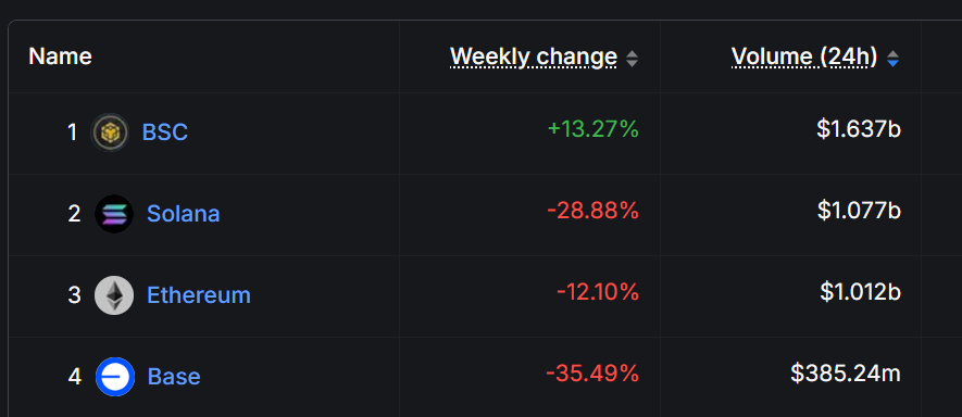 BNB Chain’s DEX has surpassed a trading volume of $1.64 billion in the last 24 hours, leaving behind Solana to take the top spot.