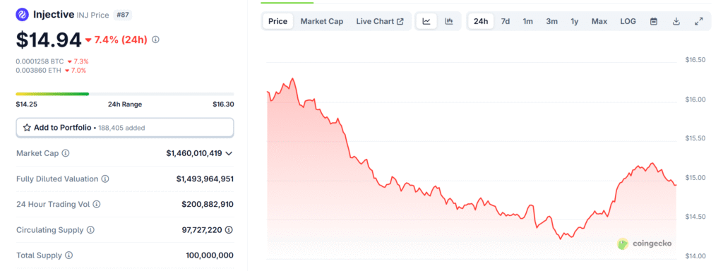 Currently, Injective (INJ) is at $14.94, down 7.38% within the last 24 hours but only 3.26% up for the week past.
