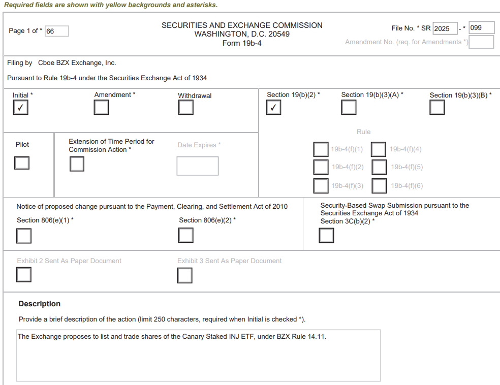 In a very crucial institutional crypto investing update, the Chicago Board Options Exchange (Cboe) has officially filed to list shares of Canary Capital’s proposed staked Injective (INJ) exchange-traded fund (ETF).