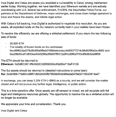 Late on Thursday night, Cetus published a notice on X(Twitter) revealing they had traced the hacker’s Ethereum wallet. The notice stated that Cetus, alongside data analytics firm Inca Digital, had reached out to the attacker.