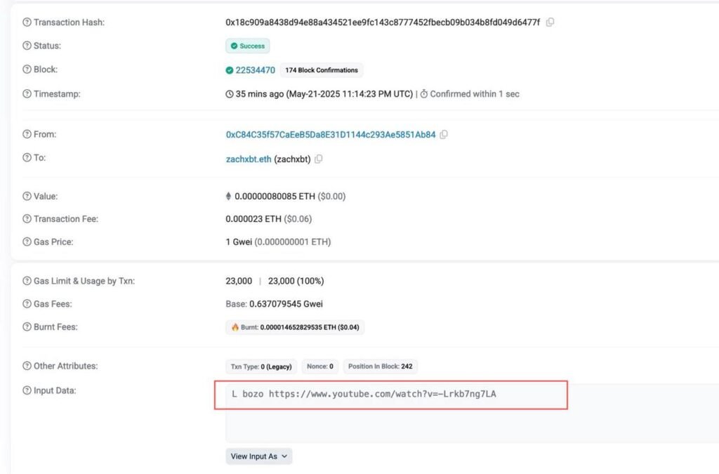The mocking message appeared directly on Ethereum’s public ledger. By embedding the insult and meme video reference into the transaction data field, the hacker ensured it would be visible to anyone examining the blockchain.