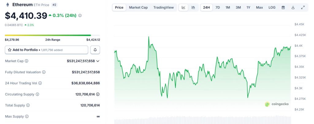 ETH is priced at $4,409.10 with a 24-hour trading volume of nearly $36.8 billion. The token has risen modestly by just 0.52% in the last 24 hours, and is still down by 7.12% in the past week.