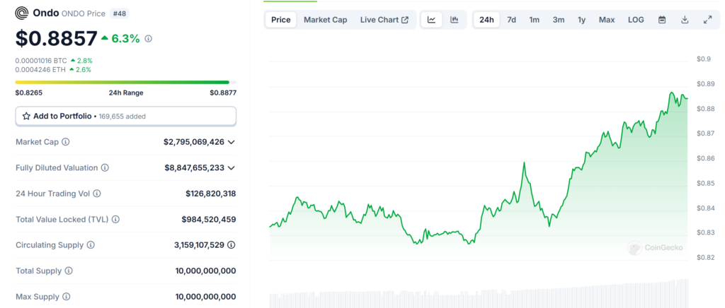 The asset’s market capitalization has reached approximately $2.79 billion, supported by a circulating supply of 3.2 billion ONDO tokens.