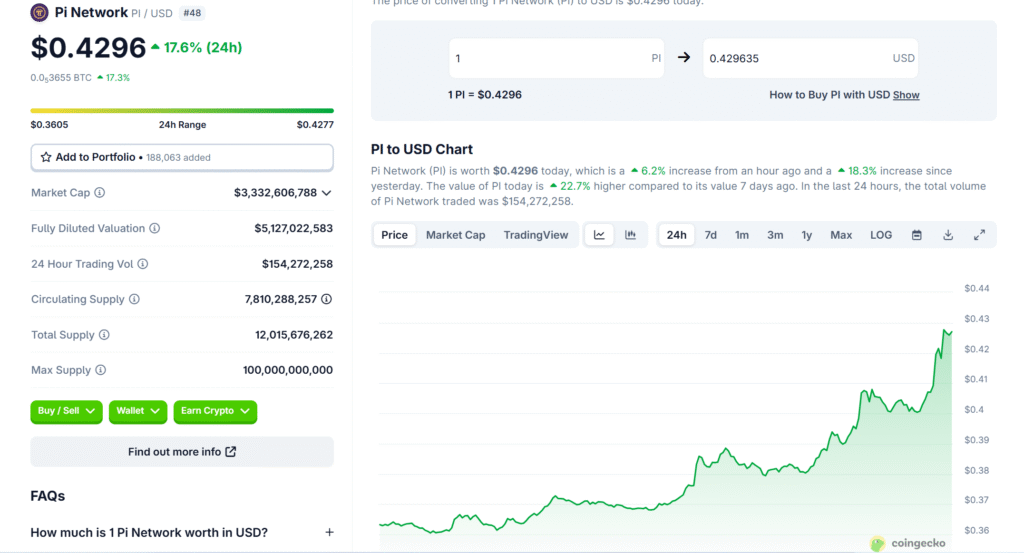 At the time of writing, $PI was valued at $0.4296, witnessing an increase of about 6.2% and 18.3% in an hour and in 24 hours, respectively, and a fabulous 22.7% in a week.