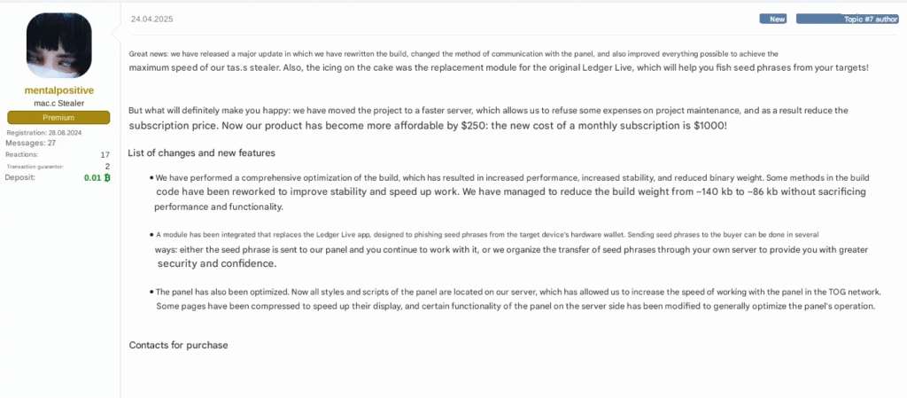 Adding to the complexity of the threat landscape is the emergence of other cybercriminals, such as the actor known as @mentalpositive, who recently advertised a new malware strain with a feature specifically designed to target Ledger Live.