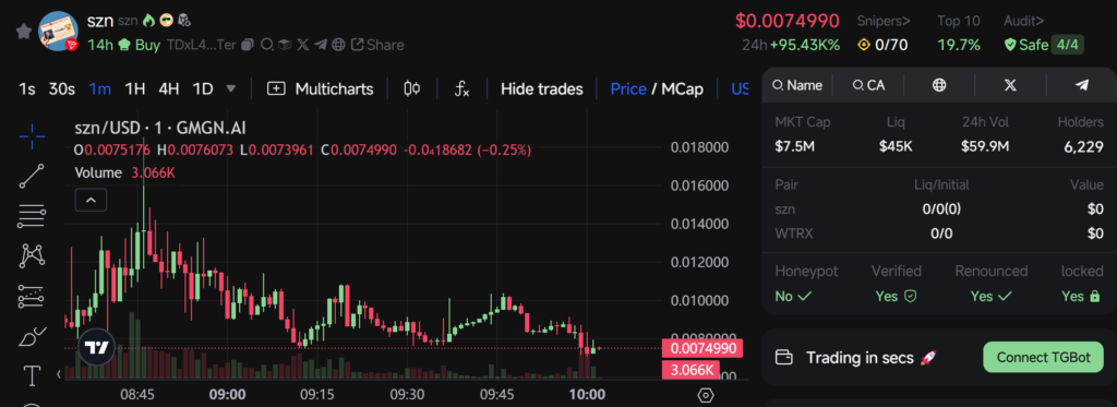 The dramatic rise of the $SZN token has captured the attention of the crypto community, as its price skyrocketed by more than 99,990% within a single day, reaching $0.0081377.