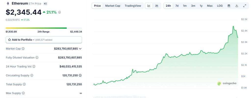 ETH is currently priced at $2,345.01, a 21.03% rise in the last 24 hours and a 28.61% increase over the past week.