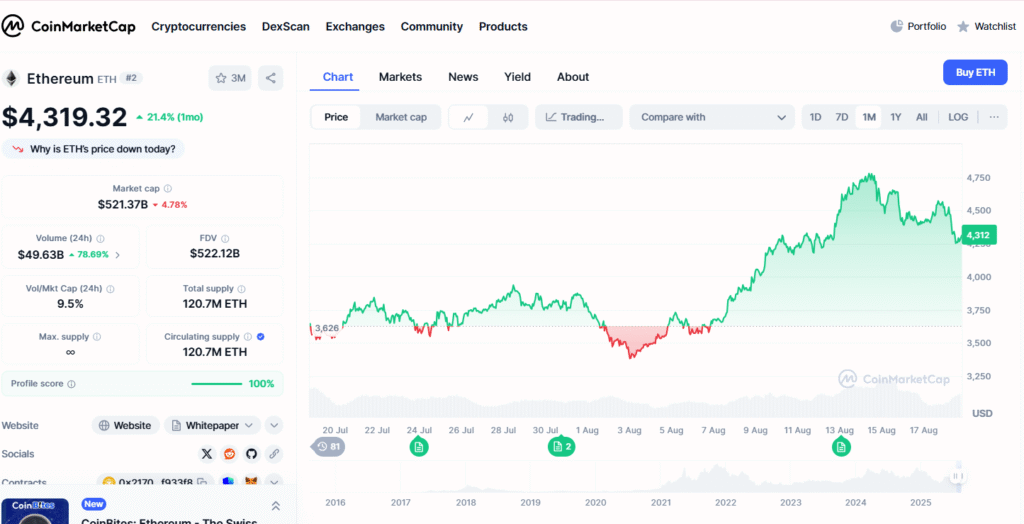 ETH is trading at $4,346.78 and was up 4.06% in the past 24 hours. The global crypto market cap sits at $4,346.78 billion, while 24-hour trading volume jumped 75.87%.