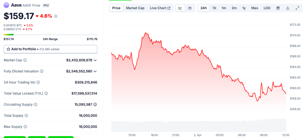 The large-scale sell-off had a noticeable impact on the AAVE token’s market performance. Following the liquidation, AAVE’s price declined to $159.17, reflecting a 4.65% drop in the past 24 hours.