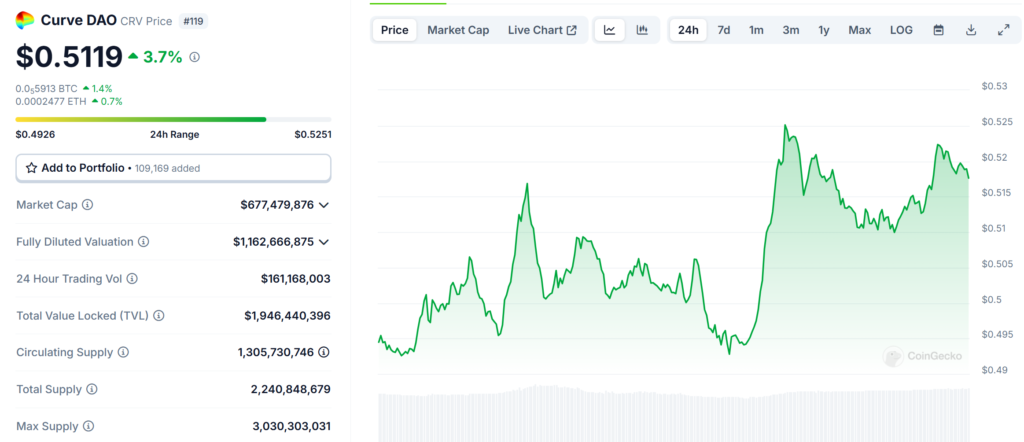 CRV’s circulating supply currently stands at 1.3 billion, with a total market capitalization of approximately $677.5 million.