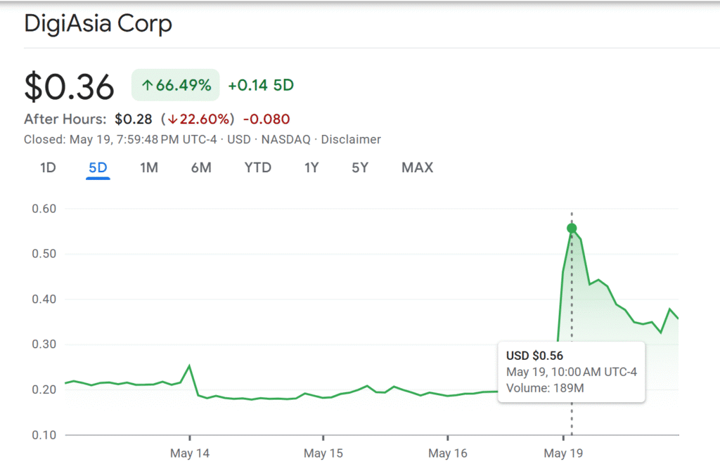 The announcement triggered an immediate market reaction, with DigiAsia’s stock price soaring by 194%, from $0.19 to $0.56, during the regular trading session.