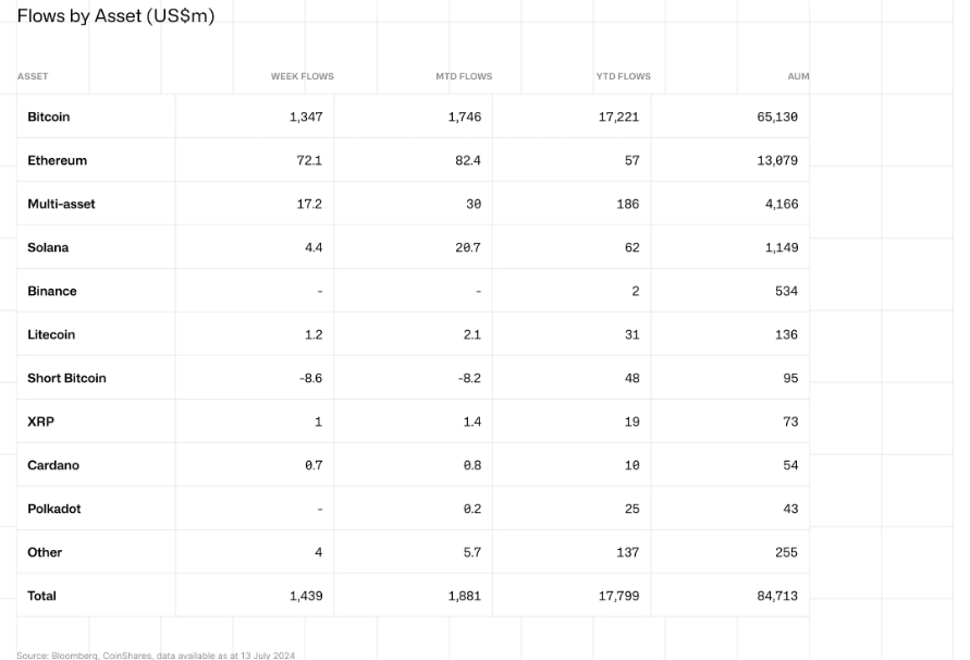 Bitcoin attracted the fifth-largest weekly inflows on file, totalling $1.35 billion. In comparison, short-bitcoin merchandise noticed the most important weekly outflows in April, amounting to $8.6 million. Analysts attribute the increased inflows to fee weakness because of the German authorities’s bitcoin income and a shift in sentiment due to lower-than-predicted U.S. CPI information.