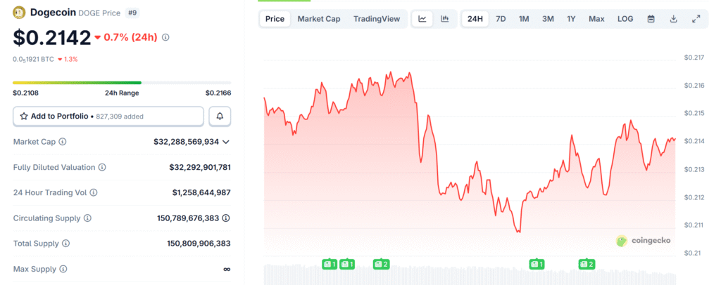 As of writing, Dogecoin is trading at $0.2142 with a market cap of $32.3 billion and daily trading volume is above $1.25 billion.