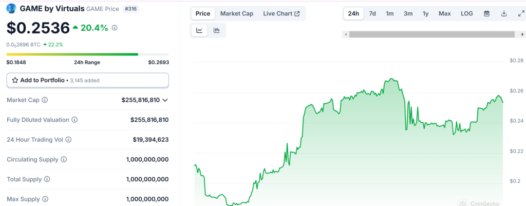 The token’s market metrics show a circulating supply of 1 Billion GAME tokens, resulting in a market capitalization of $255,816,810.