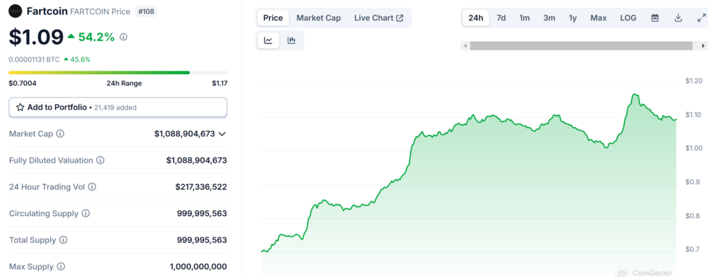 The token’s market capitalization has reached an impressive $1,088,904,673, with a circulating supply of 1 billion FARTCOIN.