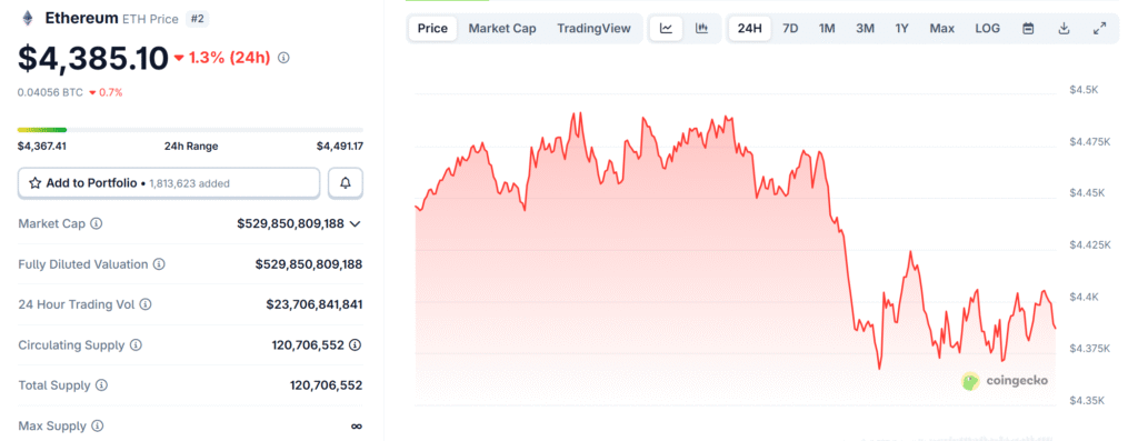 While the recent run-up brought a sense of optimism, the ETH price has been experiencing resistance at $4500 as it dipped back to $4385.38 for a slight daily decline of -1.13%, and a -5.37% loss for the week.