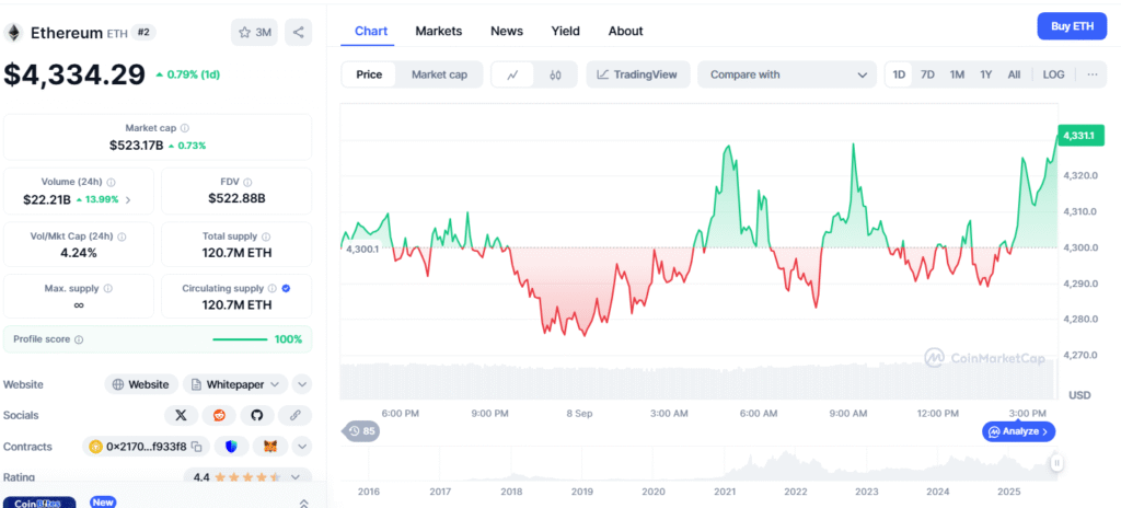At the time of these figures, ETH was trading at $4,299 and was down 0.03% in the last 24 hours. The global market cap stood at $519.2B. The 24-hour trading volume was 10.89%. Markets remain active even as the revenue story shifts.