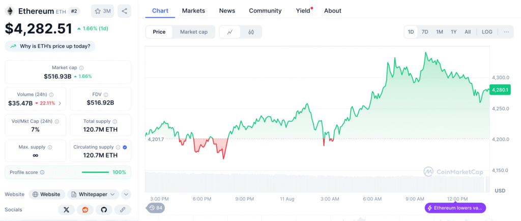 At present, ETH is trading at $4,280.22, up by 1.72% in the last 24 hours. Its 24-hour trading volume is lower, down 21.67%, suggesting some traders may be taking profits or stepping back after the strong move.