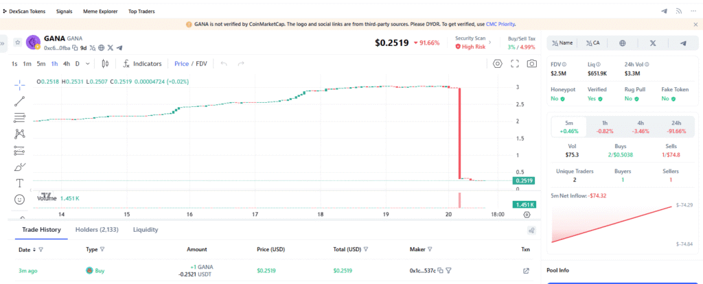 Data shows GANA’s token tumbled by more than 91% following the incident.