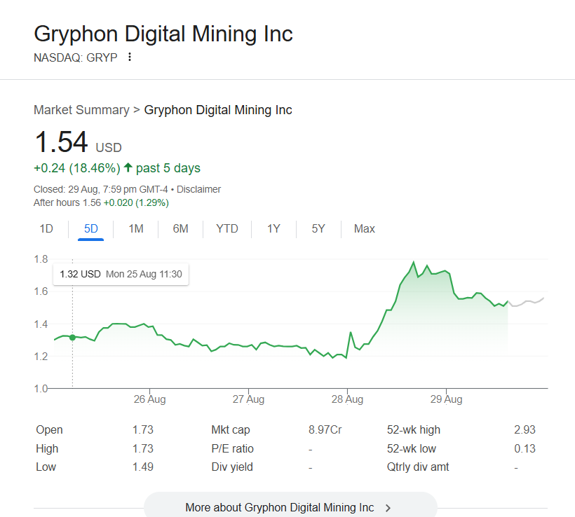 Market confidence in the deal and the company’s long-term growth prospects has driven Gryphon’s stock price up 18% since the announcement. At press time, it’s trading at $1.54, up from $1.30 in just 2 days, and has a global market cap of $127.51 million.