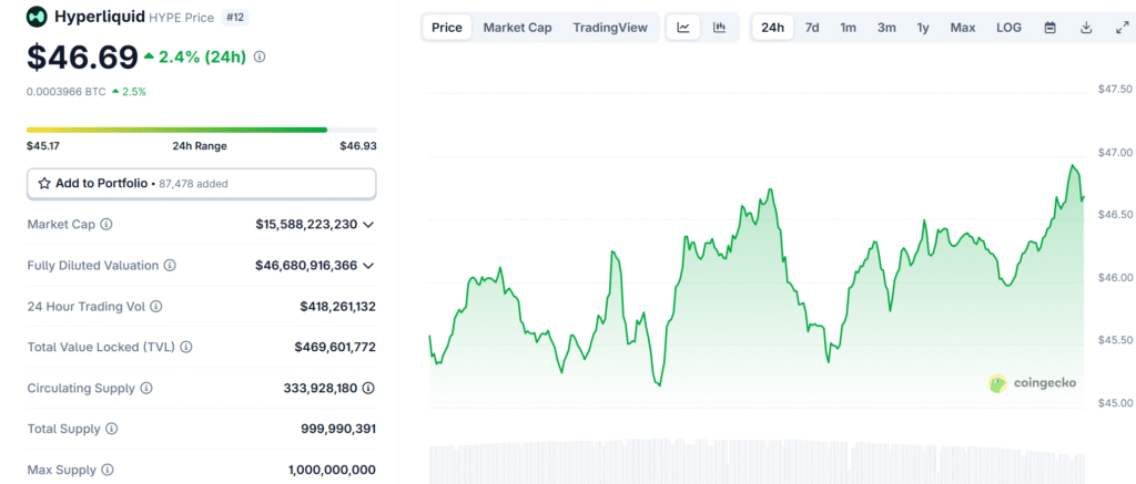 The native token of the Hyperliquid ecosystem, $HYPE, reached a new all-time high of $46.93, reflecting a strong 18% increase over the past week and a 3.46% rise in the last 24 hours.