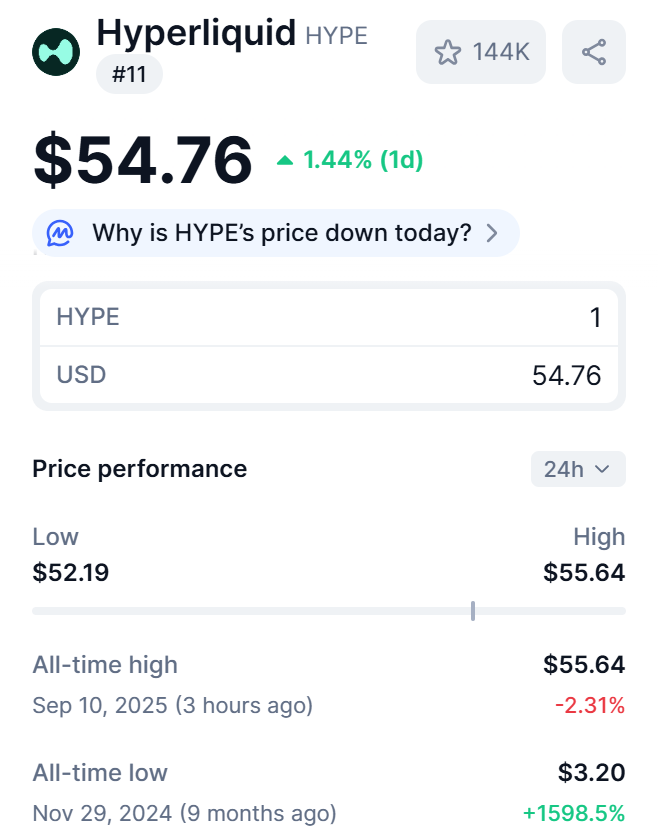 Hyperliquid ($HYPE) has just hit a new all-time high at $55.64 and is now a top digital asset by market cap.