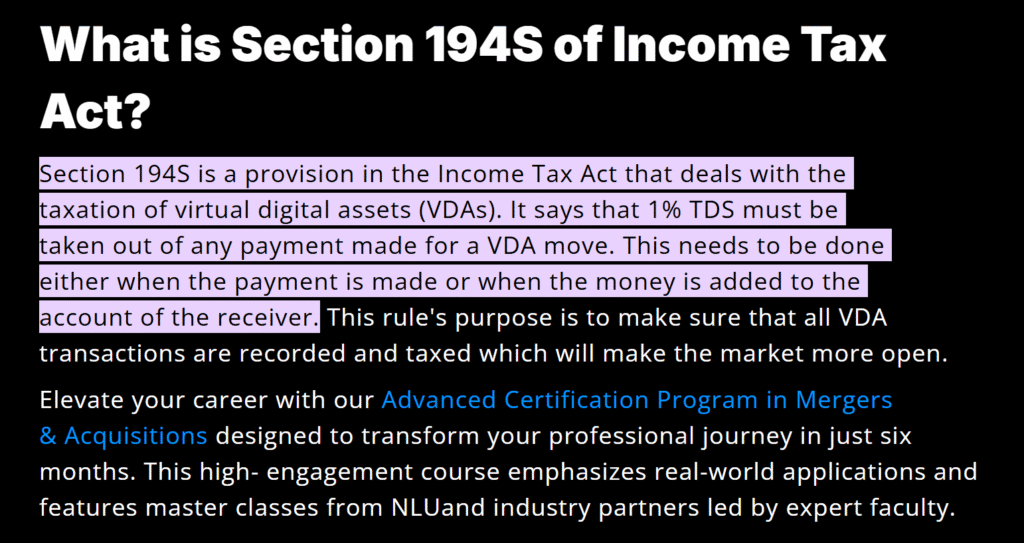 Section 194S of the Income-tax Act, brought into force by the Finance Act of 2022, requires a 1% Tax Deducted at Source (TDS) on VDA transfers.