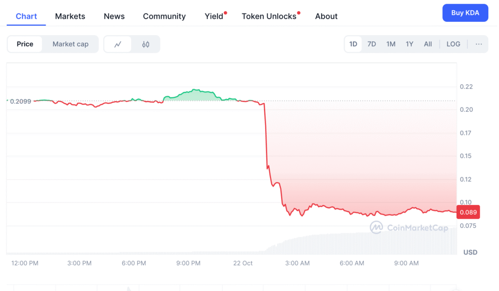 Following the founding team’s announcement that it was shutting down and stopping all network maintenance due to “market conditions,” the native token underpinning the Kadena layer 1 blockchain fell 60% in 90 minutes on Tuesday.